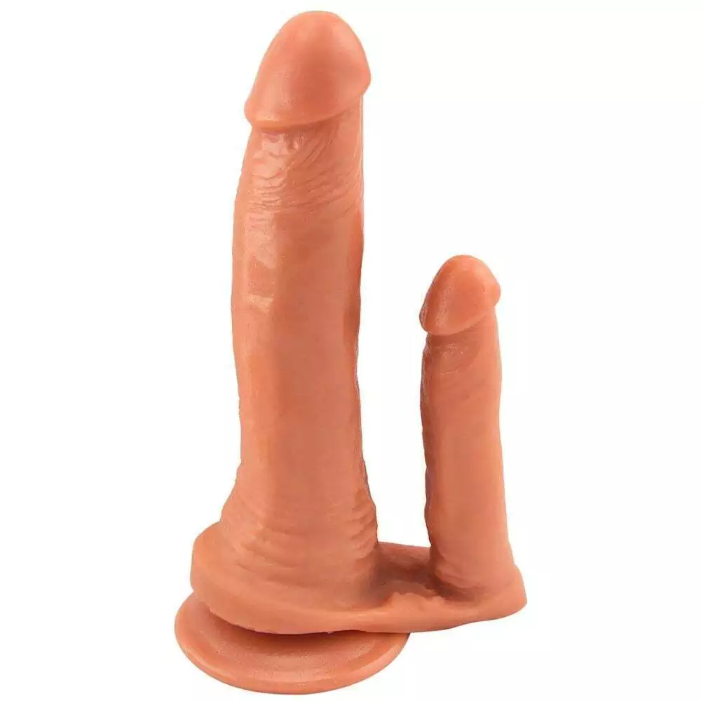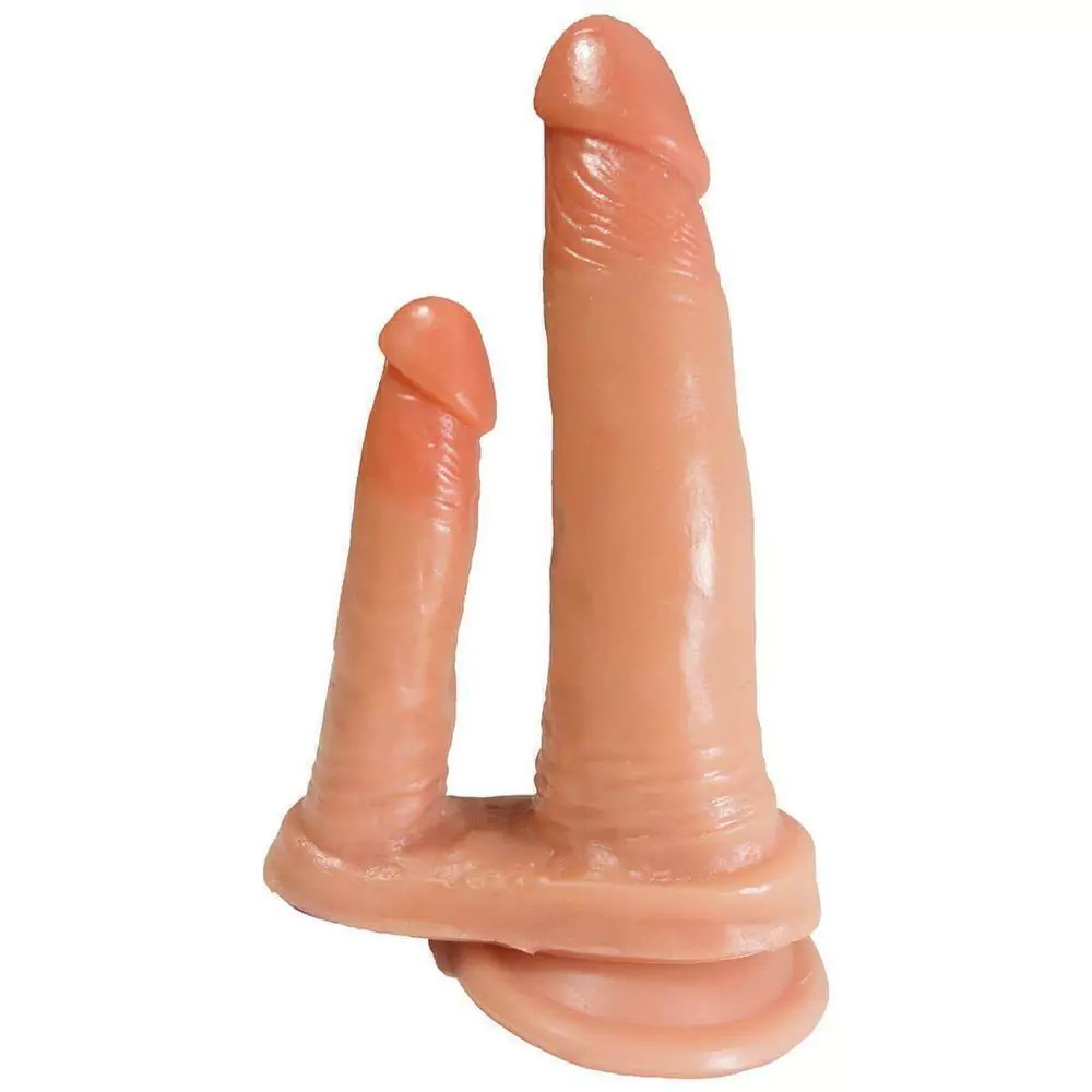 Prazer em dose dupla. Feita em polivinilico atóxico, esse modelo de prótese possui glande e veias salientes, dando um toque realístico em seu momento. Ligadas em uma base com ventosa, ela acompanha uma prótese menor, que irá proporcionar ainda mais prazer na hora da estimulação.